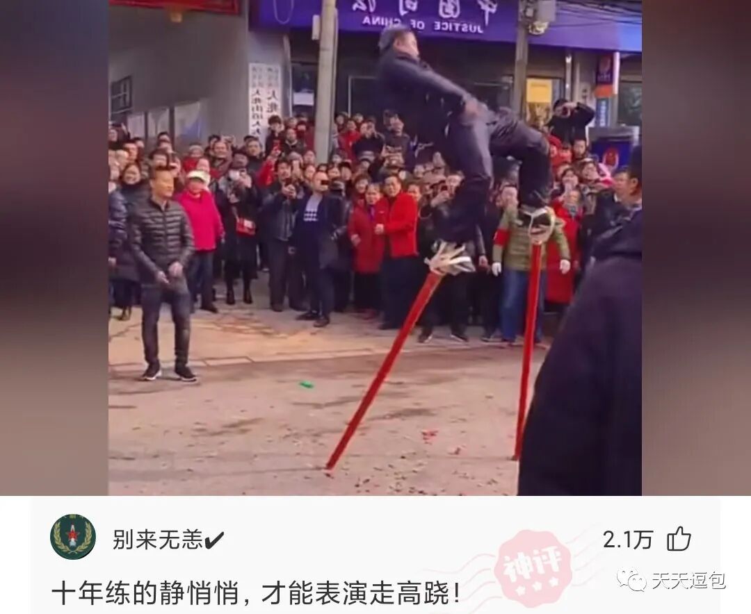 踩高跷的师傅也会青绿腰,这绝对是真功夫。帅是真的帅,危险是真的危险!