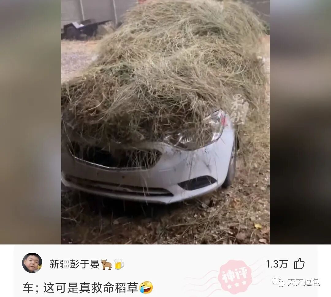 机智!男子发现外面下冰雹,赶紧用稻草将车盖住!