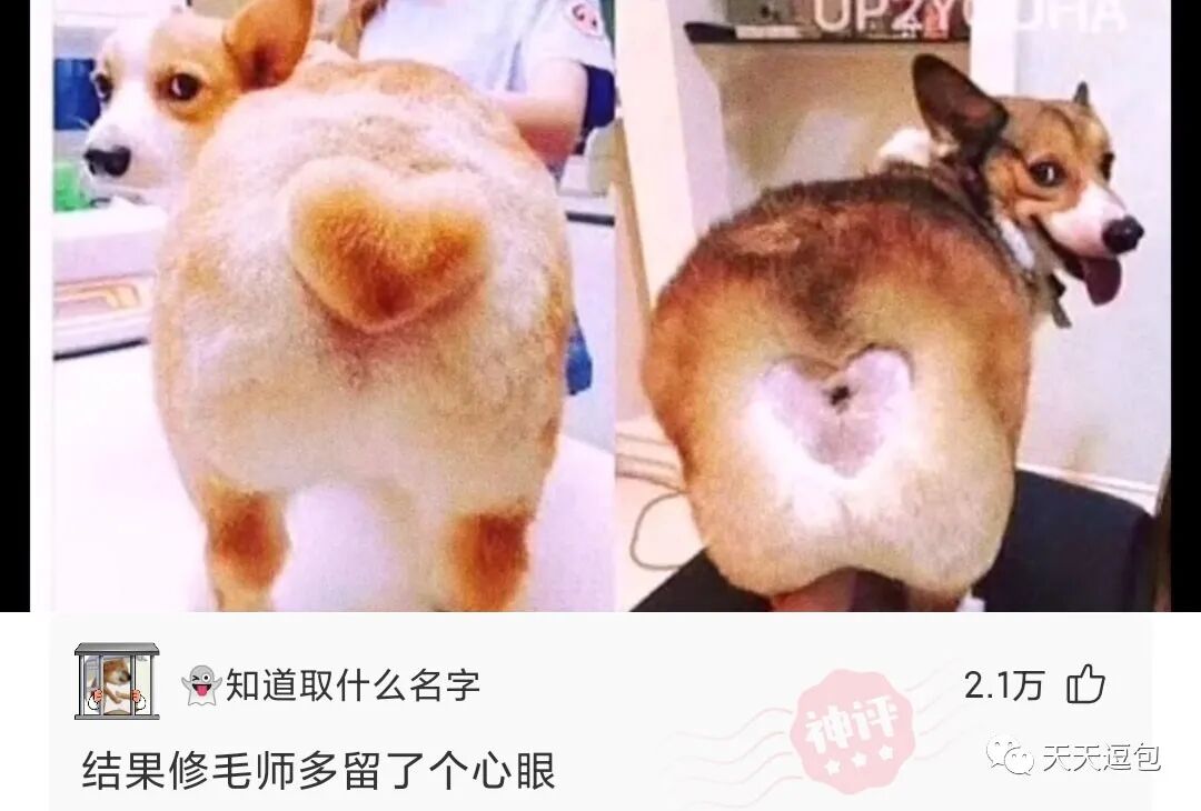 看到网上一个柯基屁股毛被修成心型很萌,于是就到宠物店让修毛师给自己的柯基屁股也修一个心型。结果。。。