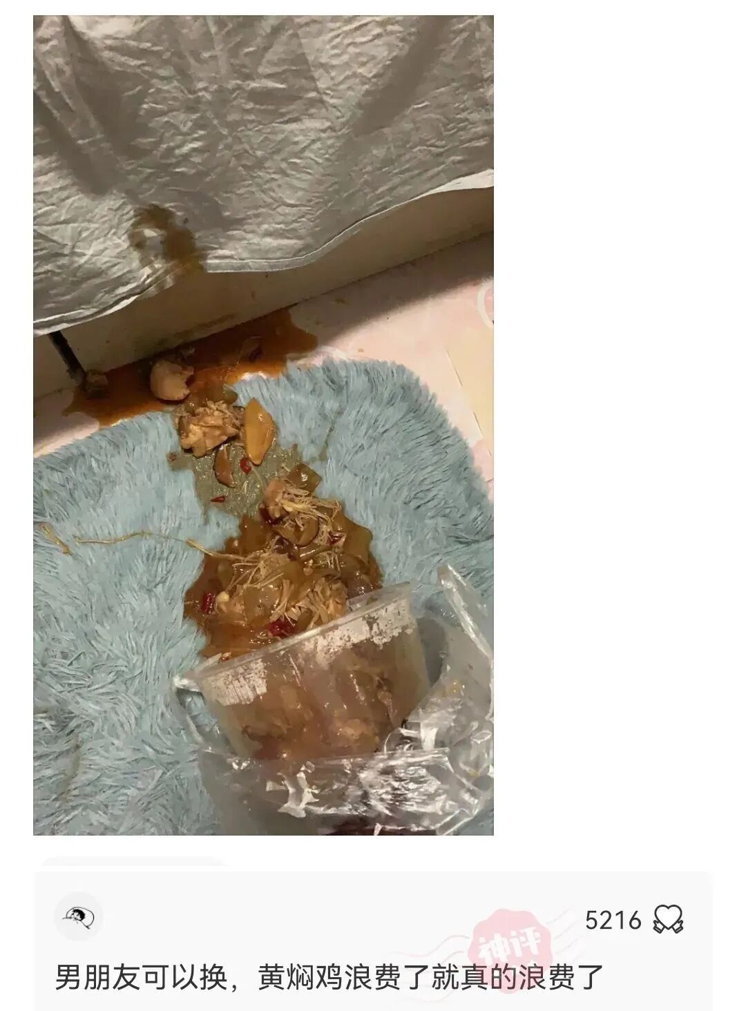 跟男朋友吵架,他一气之下把我的黄焖鸡给打翻了,地毯也弄成这样,我想问下各位,如果是你们会怎么办?