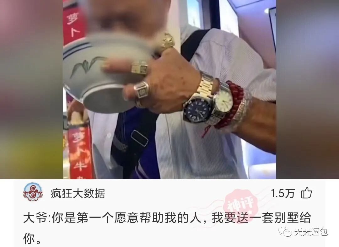 大爷进店要剩饭,好心女子新买了一份给他,端起碗时才发现手上戴满戒指、手表。。