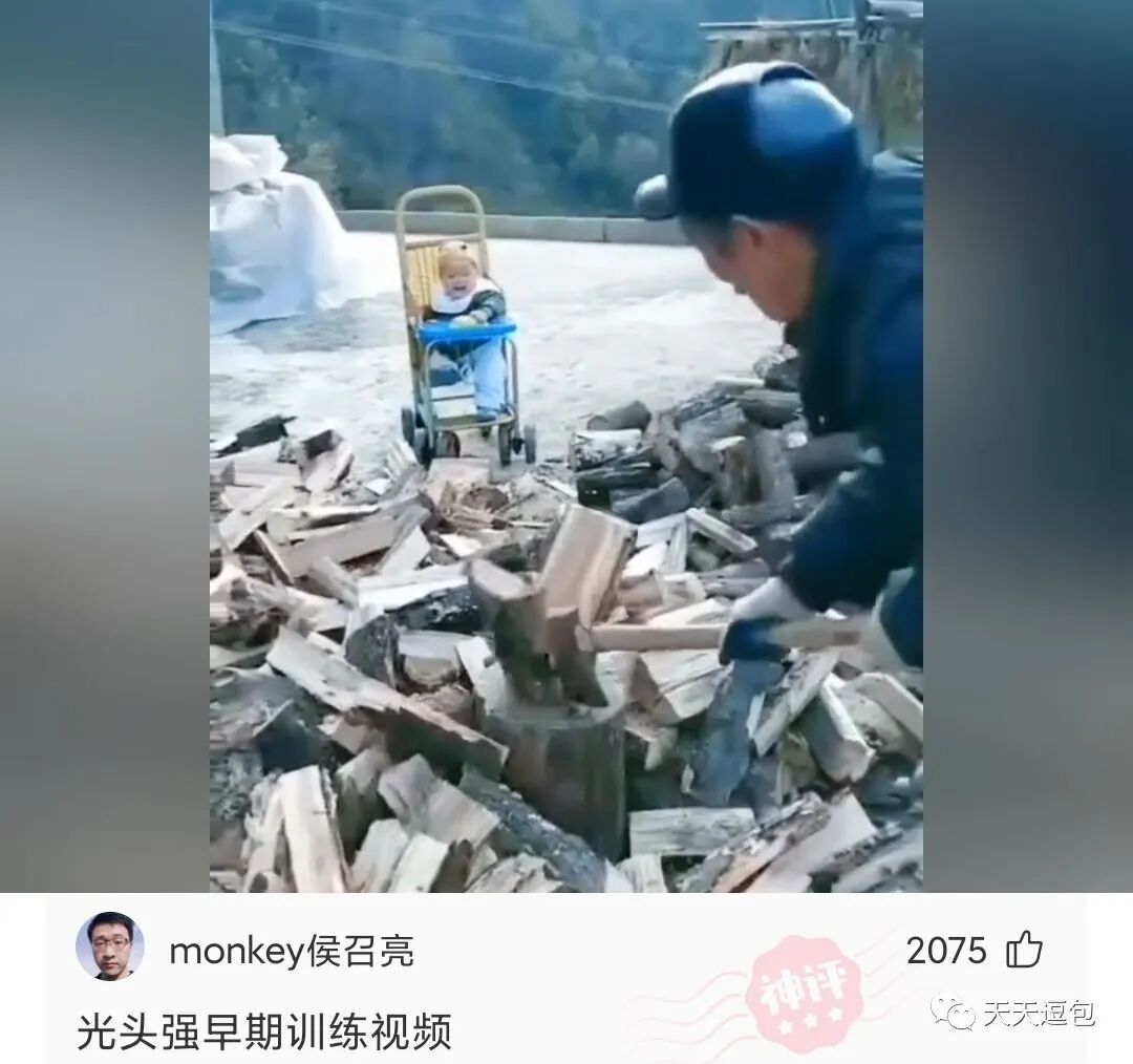 宝宝坐婴儿车里看爷爷劈柴,每砍一下都不禁哈哈大笑!