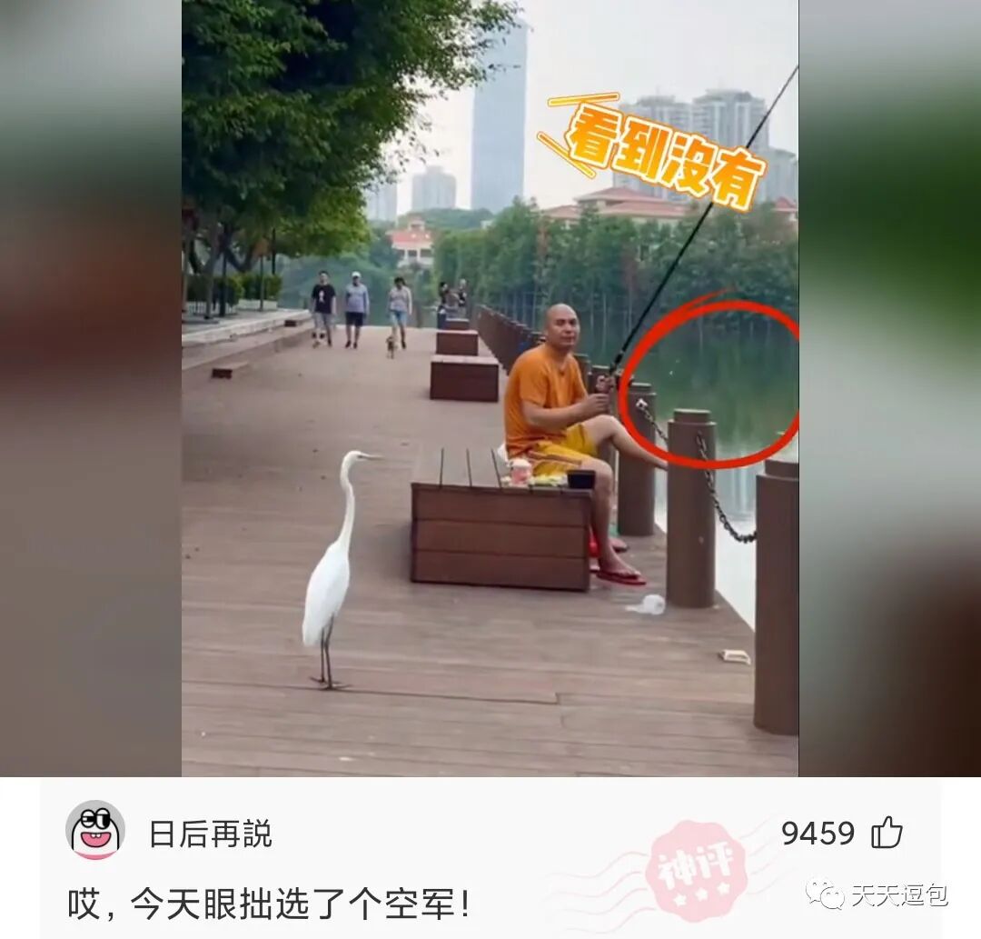 大哥湖边钩鱼,馋嘴白鹭跑上前去等鱼吃!