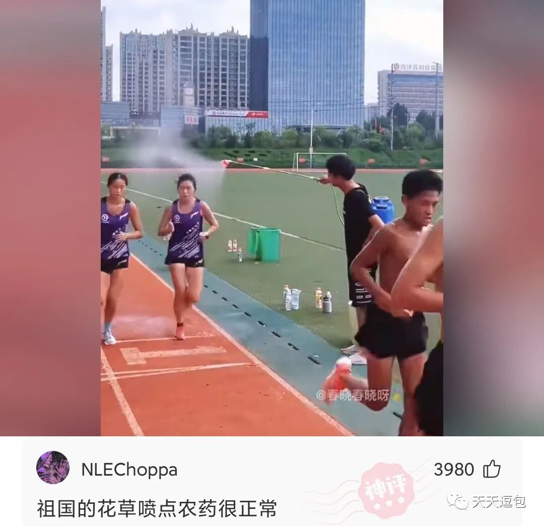 高温天气下训练,教练身背喷雾器给队员降温。网友:里面加的是快乐成长水吧!