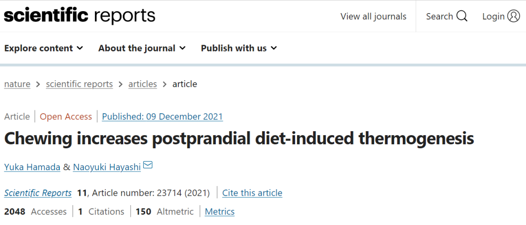 近期,日本早稻田大学科学家在《科学报告》杂志上发表了一项小规模人体研究,研究者们发现细嚼慢咽能够增加饮食引起的产热(DIT),也就是说只要吃慢点、多嚼几口、多感受食物的味道,就能消耗更多的热量!