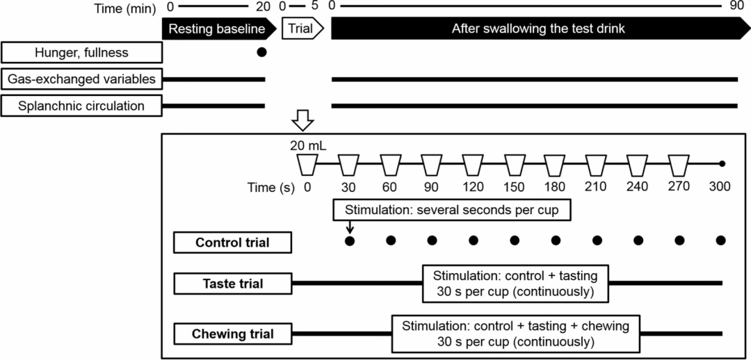 参与者们要接受三次试验。由于DIT与进入消化道的食物的体积也有很大的关系,所以这次研究中使用的食物是液体饮料(大冢可可,一份200千卡),每次试验200ml分为10杯。试验①作为对照,每30秒喝一杯;试验②,先把饮料放在嘴里含30秒再吞下,充分感受食物的味道;试验③,在30秒中每秒嚼一下,之后吞掉。