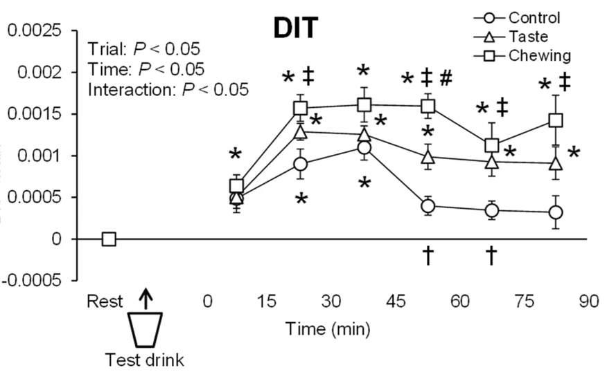 毕竟只是喝饮料,引起的DIT并不会很多,之前研究者们测试固体食物得到的数据是,咀嚼会让100千卡食物的DIT增加6千卡,300千卡食物的DIT增加10千卡,一套621千卡的正餐(含意大利面)后180分钟内的DIT增加15千卡!