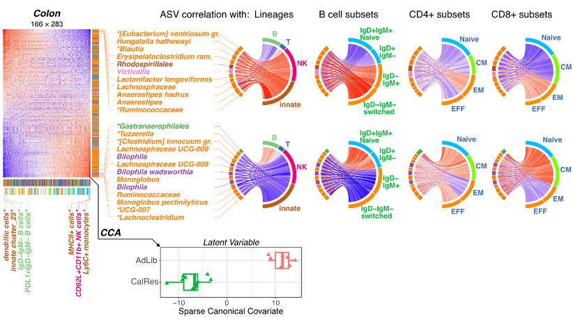 他们发现,CalRes相关菌群与幼稚CD4+和CD8+ T细胞、CD4+ 和CD8+ T中央记忆细胞亚群,以及幼稚B细胞亚群呈正相关,而AdLib组丰度较高的肠菌与结肠中转化B细胞、记忆T细胞和效应T细胞亚群呈正相关,表明热量限制对多个器官免疫衰老的推迟可能依赖于肠道菌群的改变。