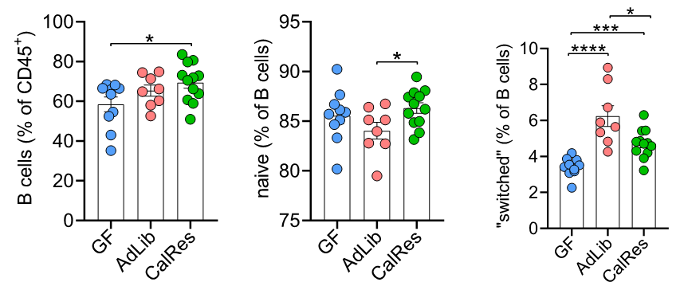 在B细胞的亚群分析中发现了类似的结果。接受CalRes微生物群定植的小鼠结肠中B细胞总体比例明显增加,其中,幼稚B细胞水平提高,而记忆B细胞水平降低。