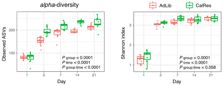 首先,Spranger团队对各组小鼠粪便样本进行了16S rRNA基因测序,以确定组间肠道菌群的差异。结果显示,与AdLib组相比,CalRes组肠道菌群表现出更高的整体α多样性,同时,与肥胖有关的红螺菌丰度显著减少。