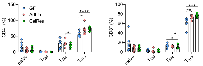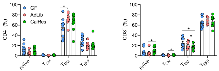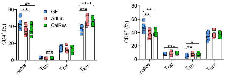 结果显示,接受人类肠菌定植的小鼠脾脏中幼稚CD4+和CD8+ T细胞总体水平降低,不受热量限制的影响,而CD4+ TEFF亚群及CD4+ TEM亚群的水平明显增加,CD8+ TCM和TEM两个亚群的比例也有所提高。