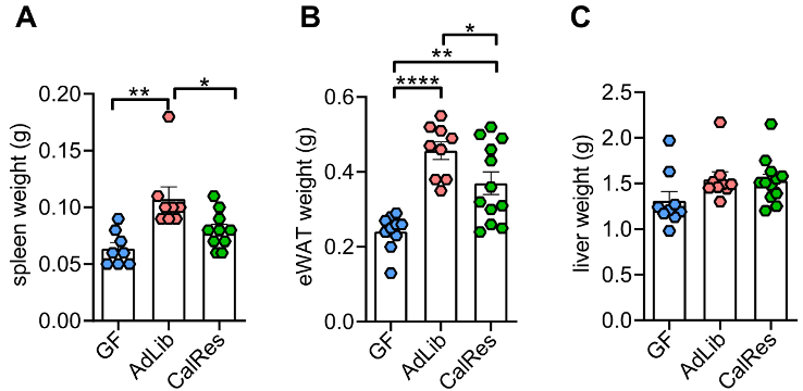 接下来,Spranger团队评估了肠菌定植对小鼠肥胖和葡萄糖代谢的影响。他们发现,接受人类肠菌定植后,小鼠表腺白脂肪组织(eWAT)、脾脏和肝脏的重量均会增加,但CalRes组小鼠eWAT的重量比AdLib组的明显轻,说明热量限制有利于减少脂肪组织。