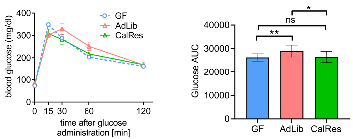 此外,口服葡萄糖耐量试验结果显示,CalRes组小鼠体内葡萄糖随时间推移趋于较低的水平,与AdLib组相比,其葡萄糖-时间曲线下面积显著减少,表明限制热量摄入诱导的肠道菌群改变可能有利于改善代谢健康。