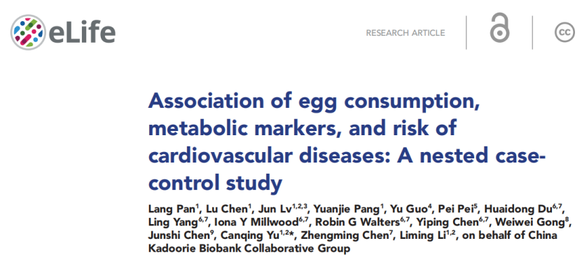 2. Pan, L.; Chen, L.; Lv, J.; Pang, Y.; Guo, Y.; Pei, P.; Du, H.; Yang, L.; Millwood, I. Y.; Walters, R. G.; Chen, Y.; Gong, W.; Chen, J.; Yu, C.; Chen, Z.; Li, L., Association of egg consumption, metabolic markers, and risk of cardiovascular diseases: A nested case-control study. Elife 2022, 11.