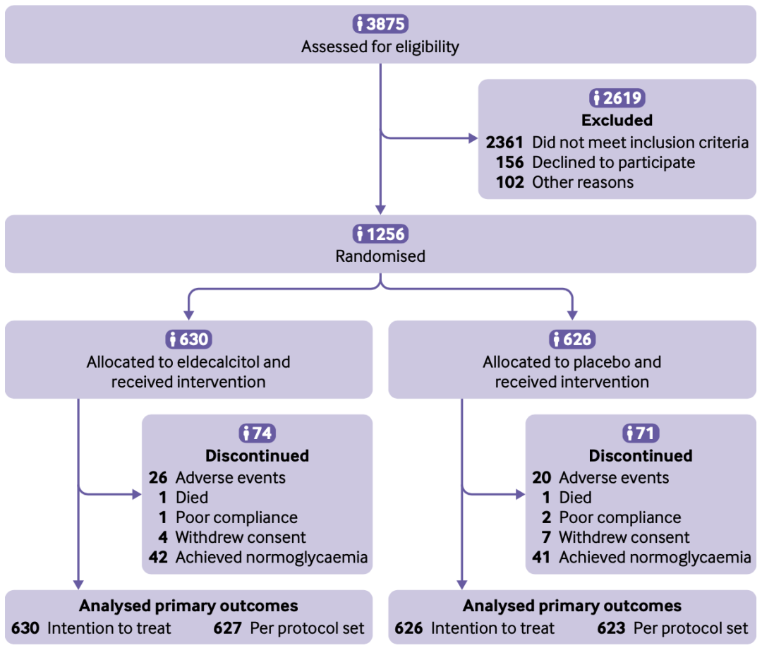 从2013年6月1日到2015年8月31日,试验从日本的32个机构共招募到3875名受试者,经筛选后,最终研究有1256名参与者,其中eldecalcitol组630人,安慰剂组626人。621名参与者为单纯糖耐量受损,635名参与者为糖耐量受损伴空腹血糖受损。