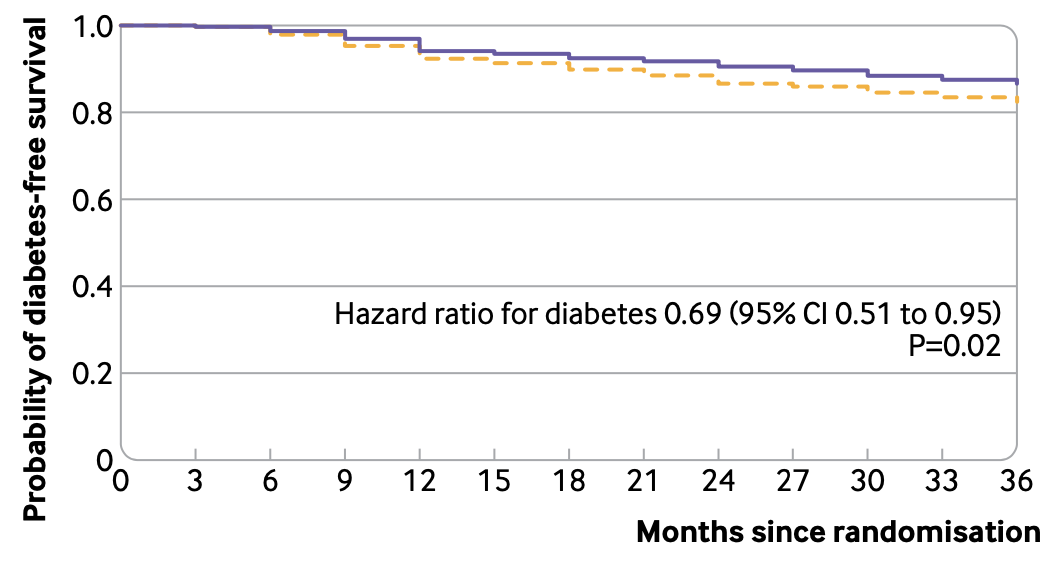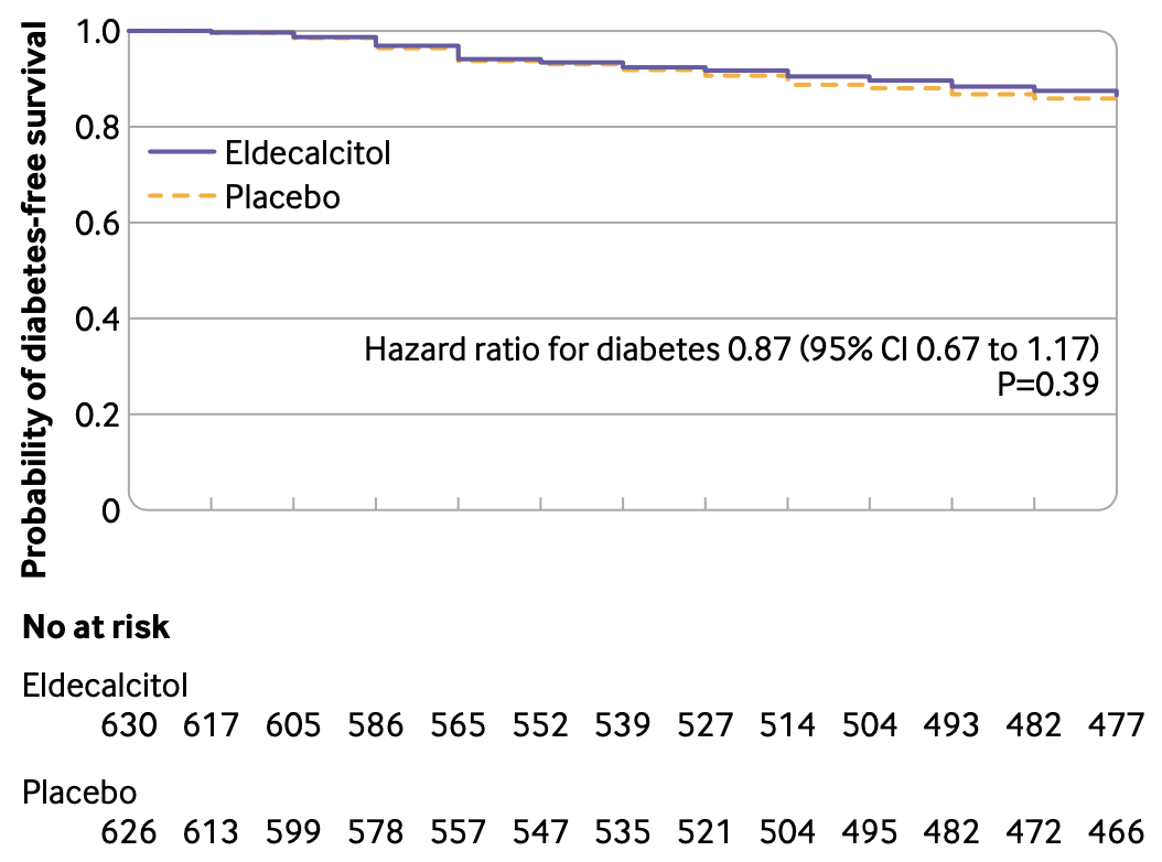 在三年的随访期内,eldecalcitol组630名参与者中有79名(12.5%)患上糖尿病,安慰剂组626名参与者中有89名(14.2%)患上糖尿病,两组之间没有明显差异(HR 0.87,P=0.39)。
