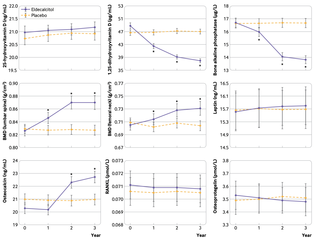 此外,eldecalcitol组受试者的腰椎和股骨颈的骨密度、血清骨钙素浓度明显高于服用安慰剂的患者。这表明eldecalcitol组对受试者的骨代谢也有一定的益处。