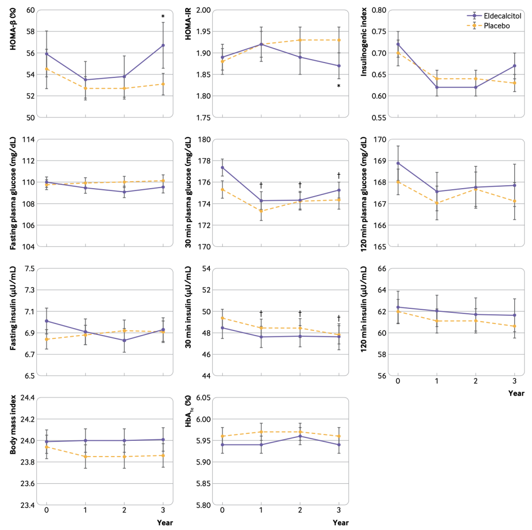 研究人员还检测了试验结束时受试者的糖代谢状态,结果显示两组化患者糖化血红蛋白和胰岛素生成指数没有显著差异,空腹和OGTT 120分钟后的血糖和免疫活性胰岛素浓度也没有差异。然而,在eldecalcitol组,OGTT 30分钟后的血糖浓度较基线显著改善,HOMA-IR显著低于安慰剂组,HOMA-β显著高于安慰剂组。这些结果表明eldecalcitol对糖耐量受损受试者的糖代谢具有一定的改善作用。