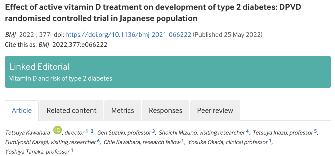 为了进一步评估补充维生素D是否能够降低糖耐量受损人群中2型糖尿病风险,Tetsuya Kawahara教授团队在日本开展了随机对照的多中心临床试验,纳入了年龄在30岁或以上的糖耐量受损人群(以1:1的比例被随机分配到eldecalcitol组(0.75 μg)与安慰剂组)。
