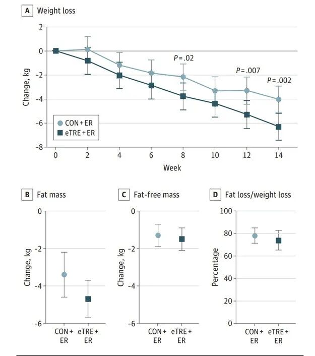 分析结果发现,14周后两组受试者体重均有下降,CON+ER组体重平均下降4kg (P<0.001),而坚持“16+8轻断食”的eTRE+ER组体重平均下降了6.3kg (P<0.001)(羡慕了,要不从明儿开始过“15”不食了?)。在同样的饮食及运动强度下,稍微管住嘴,把每天想吃的“热量”放在7点到15点之间,14周就能多减重2.3kg(P=0.002),这又何乐而不为呢?