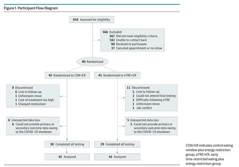 试验共纳入90名肥胖受试者(纳入标准:25-75岁,BMI在30-60 kg/m2,无糖尿病或其他严重不稳定的慢性疾病),随机将受试者按照1:1比例分为对照组(CON+ER)和eTRE+ER组。