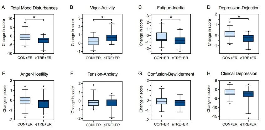 “16+8轻断食”的eTRE+ER组在14周的过程中相比于CON+ER组更能有效改善受试者整体情绪状态(P=0.02),在提升活力(P=0.04)、改善疲劳(P=0.03)及抑郁(P=0.02)方面也更为有效。(应用POMS-SF量表进行情绪评估[7])。