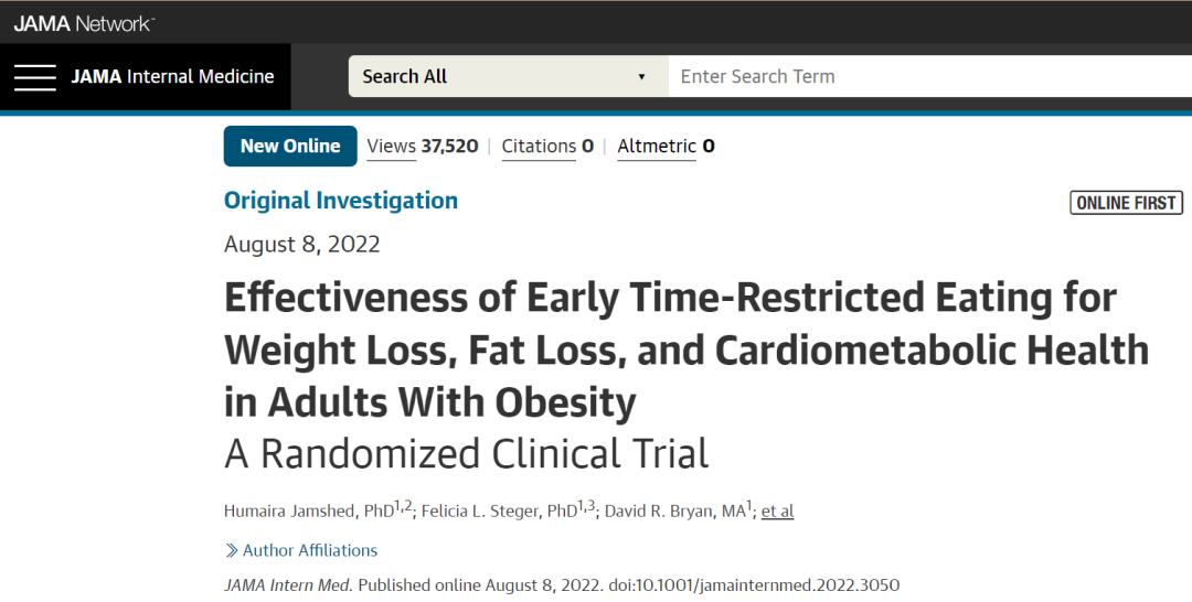 2.Jamshed, H, Steger, FL, Bryan, DR, et al. Effectiveness of Early Time-Restricted Eating for Weight Loss, Fat Loss, and Cardiometabolic Health in Adults With Obesity: A Randomized Clinical Trial. JAMA INTERN MED. 2022; doi: 10.1001/jamainternmed.2022.3050
