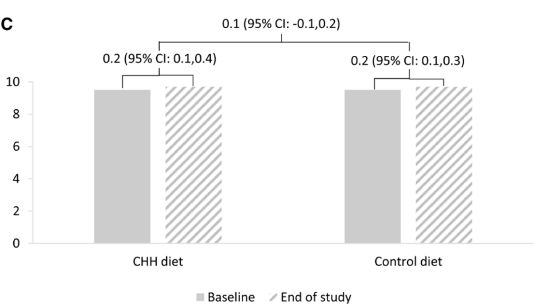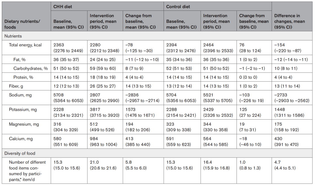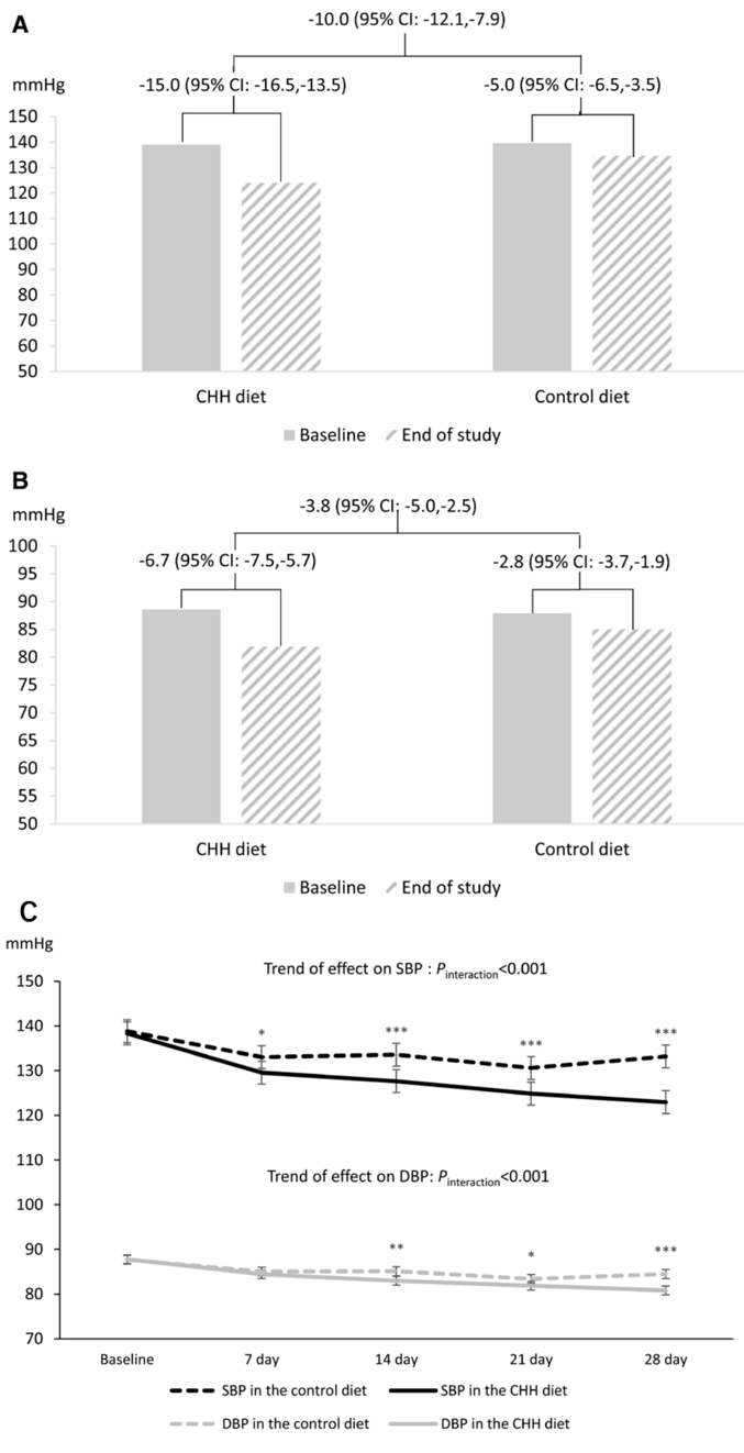 从心血管健康的角度出发,CHH饮食成功完成任务。与基线相比,CHH组志愿者收缩压(SBP)降低15.0 mmHg、舒张压(DBP)降低6.7 mmHg。与对照组相比,CHH组也净赚不少,SBP降低10.0 mmHg、DBP降低3.8 mmHg。虽然CHH组志愿者享用的美味佳肴不属于同一个菜系,但降压收益无明显差异。