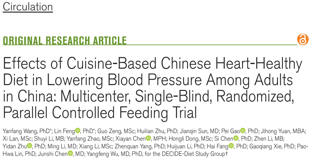 [4]Xie, W., Wang, Y., Sun, J., Zeng, G., Zhu, H., Yang, Z., Gao, P., Yang, J., Feng, L., Lin, P. H., Li, M., Xu, J., Chen, J., & Wu, Y. (2020). Protocol of a multicenter, single-blind, randomised, parallel controlled feeding trial evaluating the effect of a Chinese Healthy Heart (CHH) diet in lowering blood pressure and other cardiovascular risk factors. BMJ open, 10(8), e036394. https://doi.org/10.1136/bmjopen-2019-036394