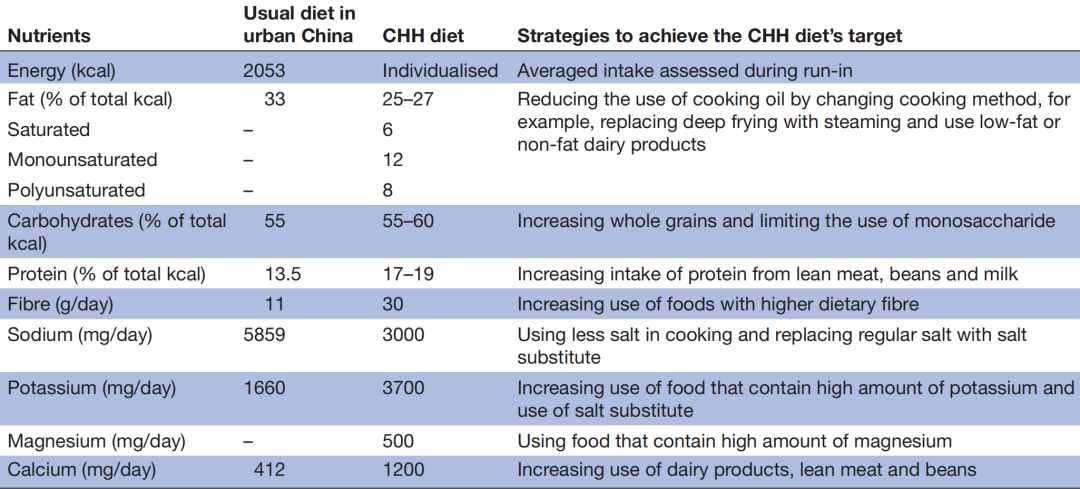为了应对这个局面,DECIDE-Diet试验启动,旨在开发一种集口感美味、方便快捷、食材健康、价格美丽于一体的中国饮食方案,通过调整饮食结构来改善中国居民的心血管健康,也就是这套中国心脏健康饮食方案(CHH)[1,4]。