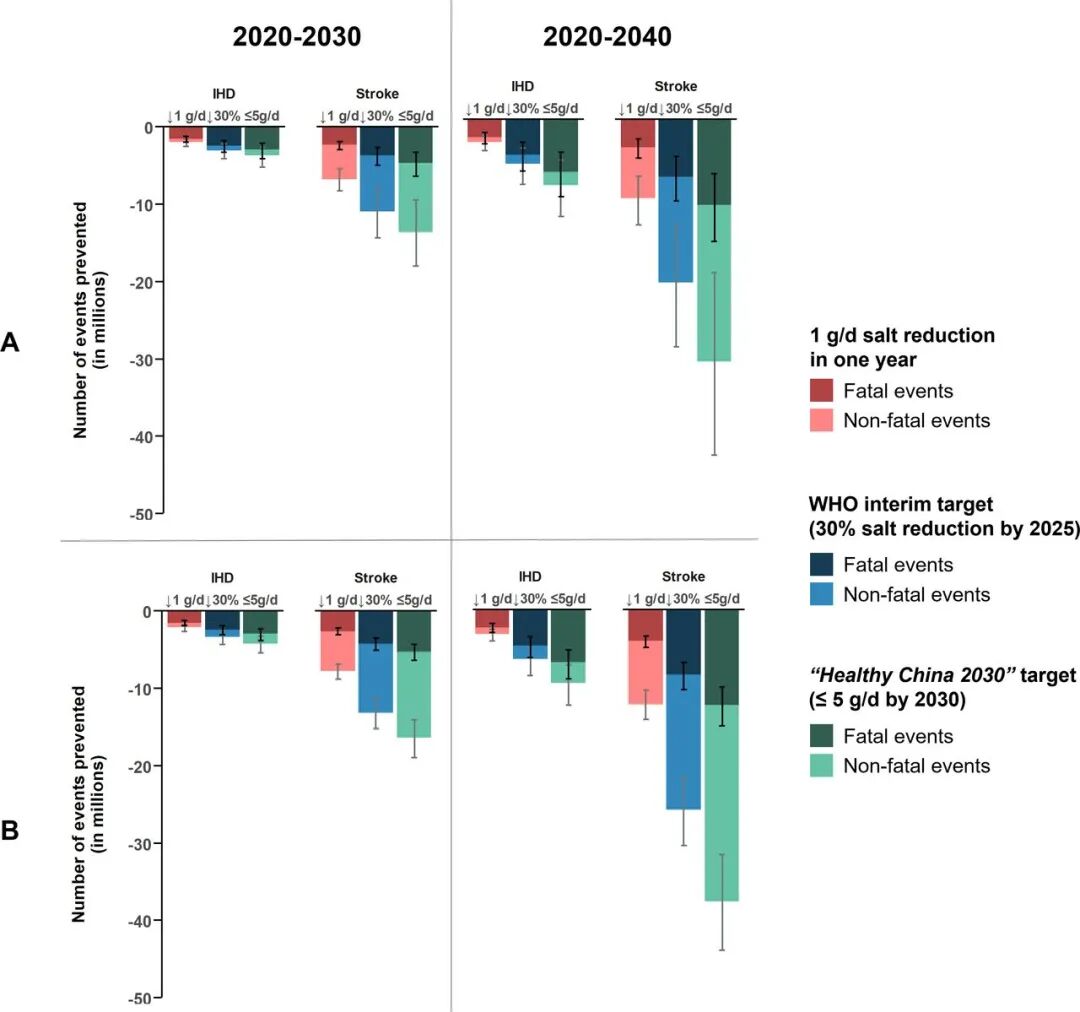 达到世卫组织推荐的限盐目标,对应的是每人每天少吃3.2克盐,这能减少我国的1400万例心血管疾病和600万例死亡;而如果步步为营,在达到这两个目标后,实现“健康中国2030”规划纲要的目标,获益就更加巨大了。