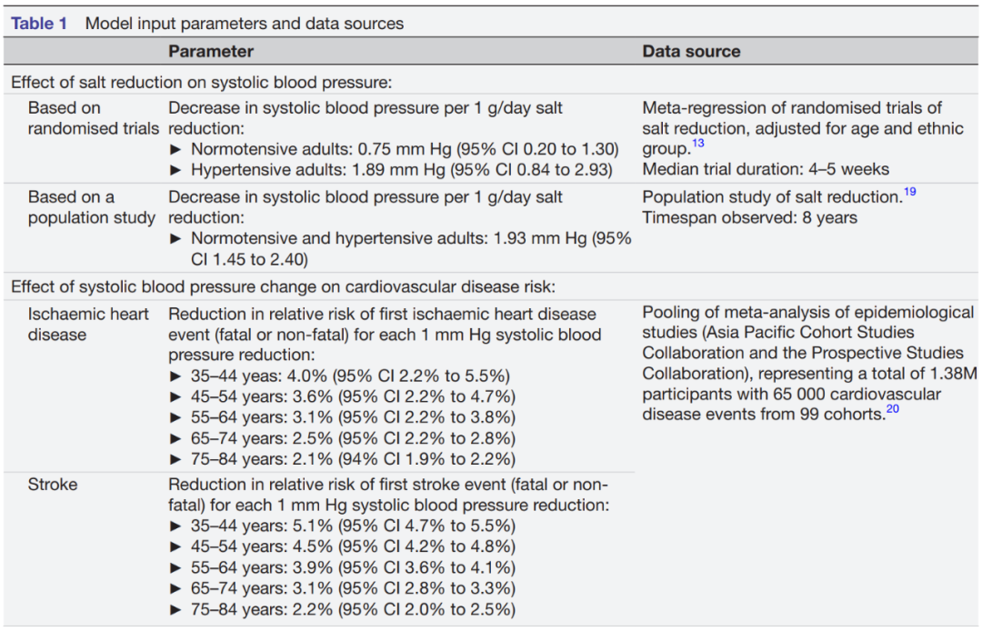 研究者们采用了两步走的建模策略,首先汇总最新的随机对照临床研究和队列研究数据,评估少吃盐对血压的影响,再把对血压的影响“换算”成降低心血管风险的获益,分析的心血管疾病则限定为缺血性冠心病和卒中这两大“魔头”。