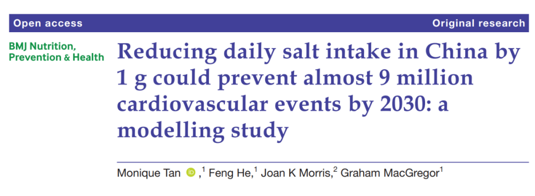 1.Tan M, He F, Morris J K, et al. Reducing daily salt intake in China by 1 g could prevent almost 9 million cardiovascular events by 2030: a modelling study[J]. BMJ Nutrition, Prevention & Health, 2022: e000408.