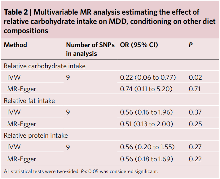 在相反方向的MR分析中,即以MDD的遗传倾向作为暴露,来探索该疾病对饮食组成的影响。结果并没有发现MDD与相对碳水化合物摄入,或相对脂肪摄入量以及相对蛋白质摄入量之间有因果关系。因此,抑郁症并不影响相对碳水化合物摄取量,排除了碳水与MDD相关性之间相反的因果关系。