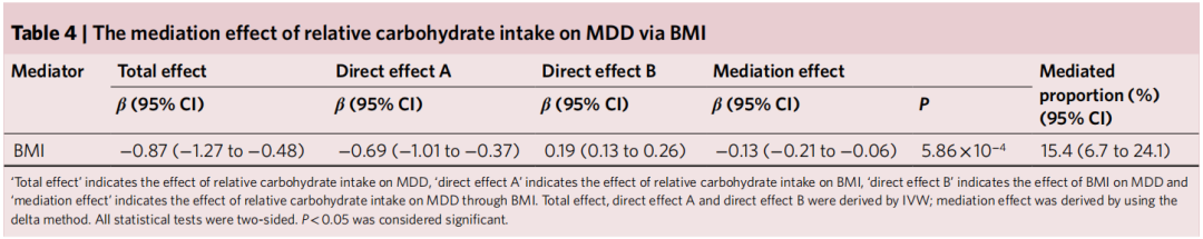 此项研究向我们展示了基因层面的分析结果:相对碳水化合物摄入量与MDD之间存在保护性因果关系,此种关系在调节其他饮食组成后仍然存在;而BMI部分介导了该保护作用。