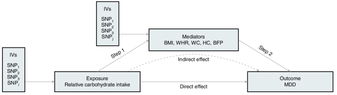鉴于饮食因素在预防和控制肥胖方面至关重要,与肥胖相关的指标,如体重指数(BMI)、体脂率(BFP)、调整BMI后的腰臀比(WHR)、调整BMI后的臀围(HC)和腰围(WC),可能介导了碳水化合物对MDD的保护作用。通过MR分析,以上的五个指标中,只有BMI在相对碳水化合物摄入和MDD之间展现出了中介作用,中介效应为-0.13,大约介导了15.4%的影响。其他指标对MDD的影响不显著。