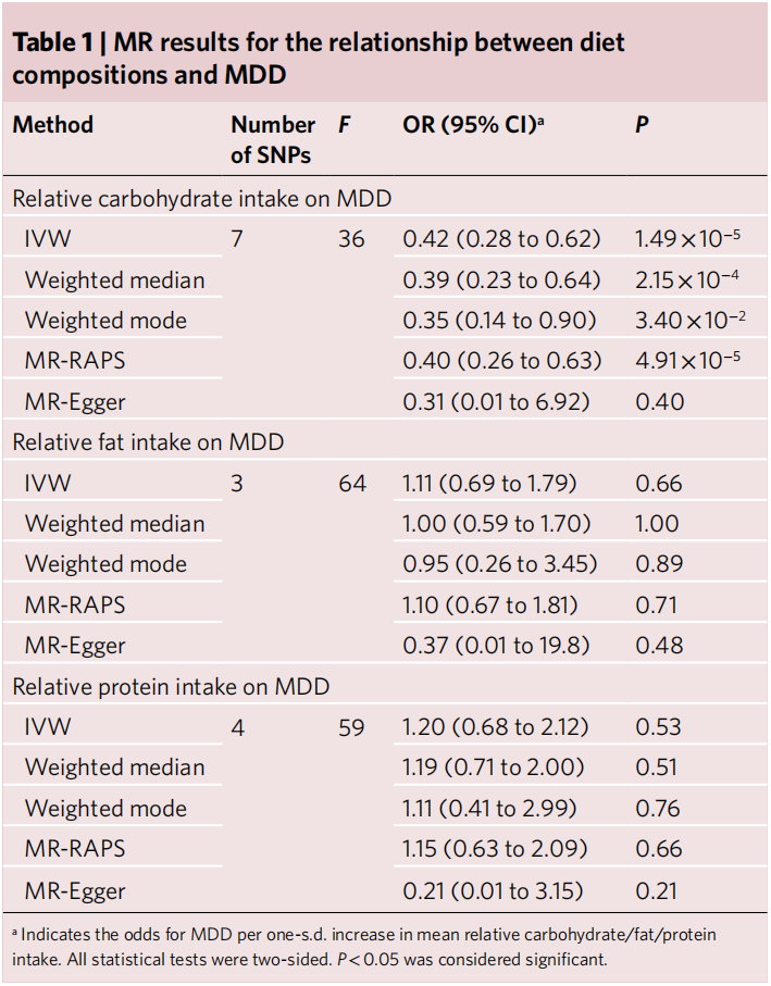 近日,中国西安交通大学的郭燕教授和杨铁林教授领衔,在Nature Human Behaviour上发表重要研究成果,他们利用超40万人的基因样本进行了孟德尔随机化分析(MR analysis),结果显示,相对碳水化合物摄入量增加与重度抑郁症(MDD)风险降低有关。碳水化合物摄入每增加335千卡,MDD风险降低58%[8]。