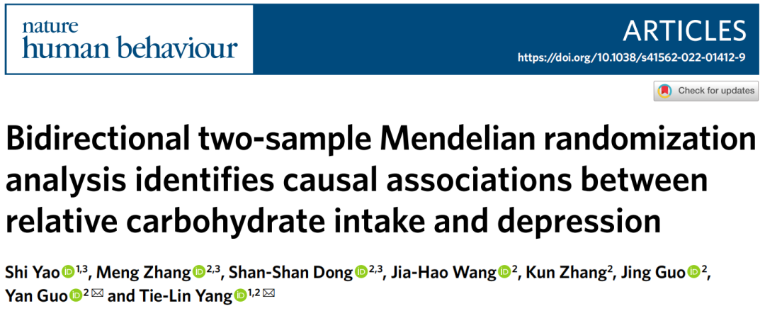 8. Yao S, Zhang M, Dong SS, Wang JH, Zhang K, Guo J, Guo Y, Yang TL. Bidirectional two-sample Mendelian randomization analysis identifies causal associations between relative carbohydrate intake and depression. Nature Human Behaviour. 2022 Jul 18. doi: 10.1038/s41562-022-01412-9. Epub ahead of print. PMID: 35851841.