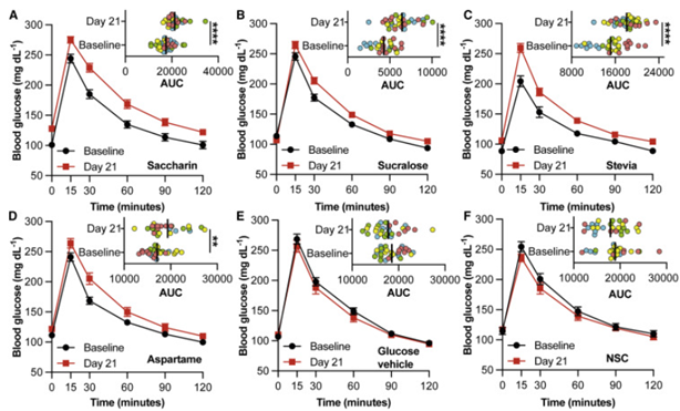 研究者发现,对于严格不使用NNS的健康志愿者来说,膳食补充三氯蔗糖和糖精会损害其血糖反应。此外,四种NNS显著改变了志愿者粪便和口腔微生物组和血浆代谢组。动物模型进一步表明,NNS通过肠道微生物介导宿主对血糖的反应。