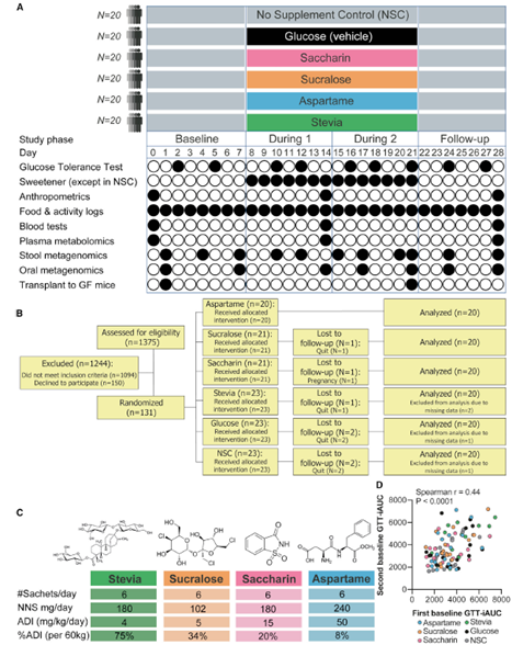 他们开展了一项旨在评估NNS对人类代谢健康和微生物组影响的随机对照试验。研究者共测试了4种NNS,分别是阿斯巴甜(aspartame)、糖精(saccharin)、甜叶菊(stevia)和三氯蔗糖(sucralose)。