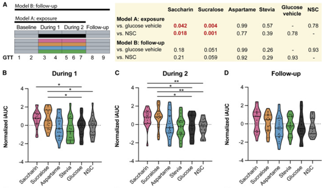 研究者建立了两个线性混合效应模型,模型A包括基线和干预期的7个GTT数据,模型B包括所有GTT数据(图2A)。分析结果显示,与两组对照相比,膳食补充糖精和三氯蔗糖后,在模型A中,参与者血糖反应显著升高,但在模型B不显著(图2A)。不过,在两种模型中,膳食补充阿斯巴甜和甜叶菊均未显著影响参与者血糖反应(图2A)。