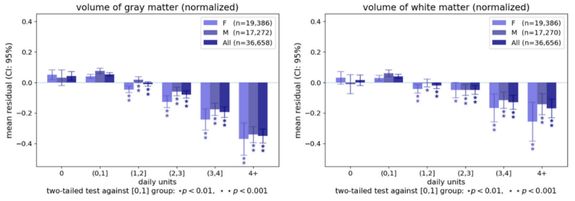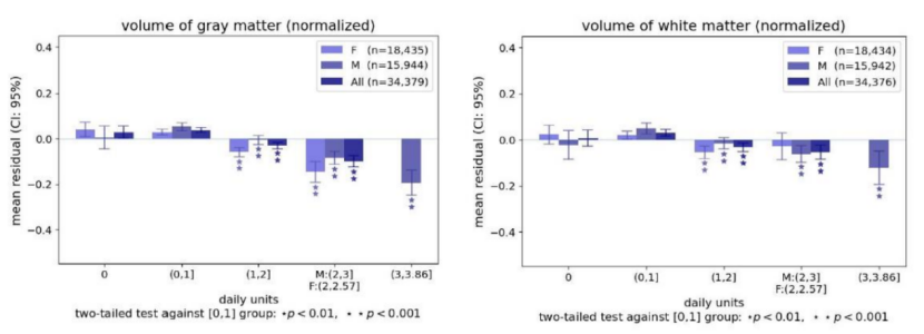 根据饮酒量将参与者分组后,不难发现,每天0到1个酒精单位对脑容量没有明显影响,但每天1到2个酒精单位与大脑灰质和白质减少就显著相关。