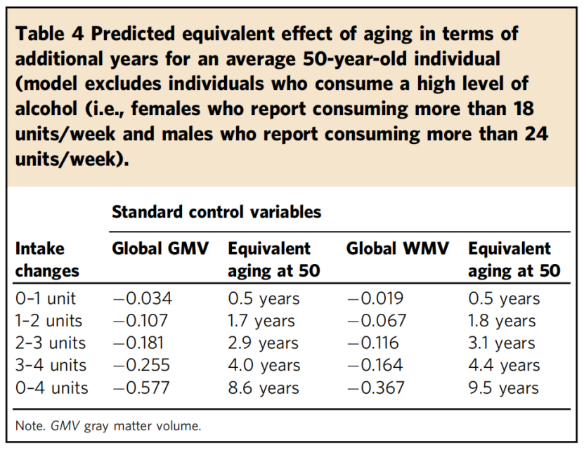 通过建模得知,对于50岁的人群,从滴酒不沾到每天摄入4个酒精单位,相当于大脑衰老了超过10岁!