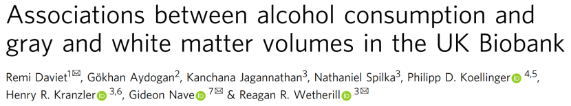 [1] Daviet R, Aydogan G, Jagannathan K, et al. Associations between alcohol consumption and gray and white matter volumes in the UK Biobank. Nat Commun. 2022;13(1):1175. Published 2022 Mar 4. doi:10.1038/s41467-022-28735-5.