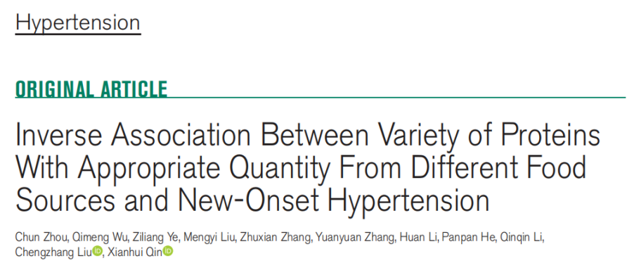 [1]Zhou C, Wu Q, Ye Z, et al. Inverse Association Between Variety of Proteins With Appropriate Quantity From Different Food Sources and New-Onset Hypertension [published online ahead of print, 2022 Mar 10]. Hypertension. 2022;HYPERTENSIONAHA12118222. doi:10.1161/HYPERTENSIONAHA.121.18222