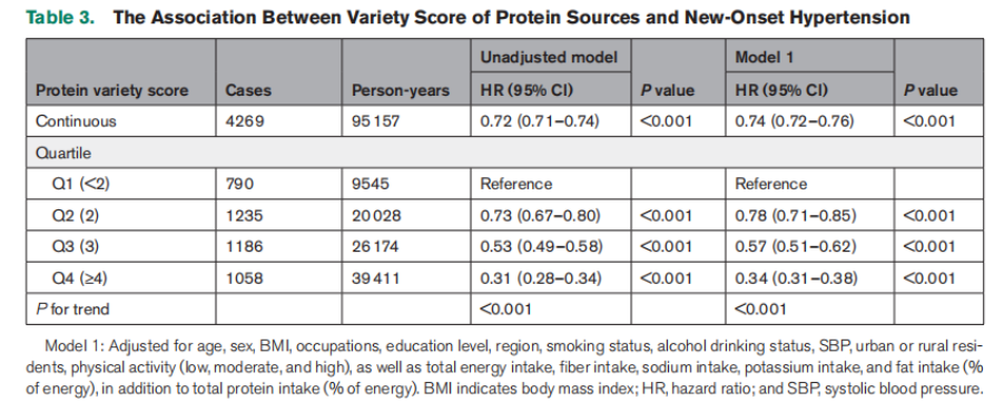 近日,一项基于中国健康与营养调查(CHNS)数据的分析显示,不同食物来源的适量蛋白质摄入与高血压发病风险下降有关。蛋白质摄入的多样性越高,高血压发病风险越低,蛋白质摄入的多样性评分最高组与高血压发病风险下降66%有关!该研究来自南方医科大学科研团队,论文发表在高血压领域权威期刊Hypertension[1]。