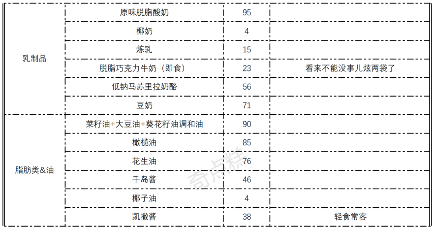 剩余几种食品的平均得分,谷物为33.8,乳制品为43.1,脂肪类&油为29.7,调味料为42.2,各种食品组合为33.1。