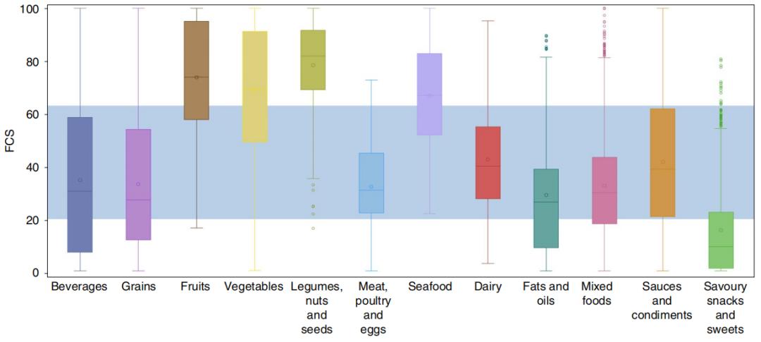 研究人员利用Food Compass对8032种食品完成评分,这些食品可分为12个种类:饮料、水果、谷物、蔬菜、豆类&坚果&种子、肉蛋类、海鲜、乳制品、脂肪类&油、调味料、零食&甜点、各种食品组合。