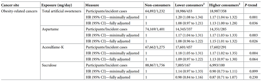 具体到特定癌症种类的话,阿斯巴甜的较高摄入量与乳腺癌患病风险增加22%显著相关(HR 1.22,95%CI 1.01-1.48)。而且也逃不过“肥胖病”,阿斯巴甜的较高摄入量与所有以肥胖为诱因的癌症(结直肠癌、胃癌、肝癌、食道癌、卵巢癌、前列腺癌等)患病风险增加15%显著相关(HR 1.15,95%CI 1.01-1.32)。