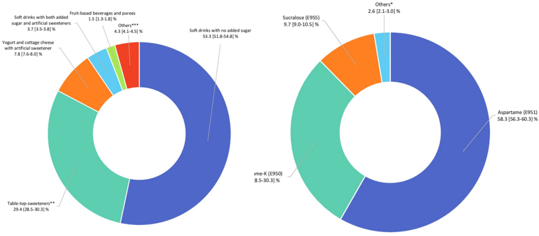 从种类上看,参与者们摄入的人工代糖以阿斯巴甜为主,占总量的58.3%;其次是安赛蜜,占总量的29.4%,其它的人工代糖如蔗糖素、甜蜜素、糖精等占比较小。